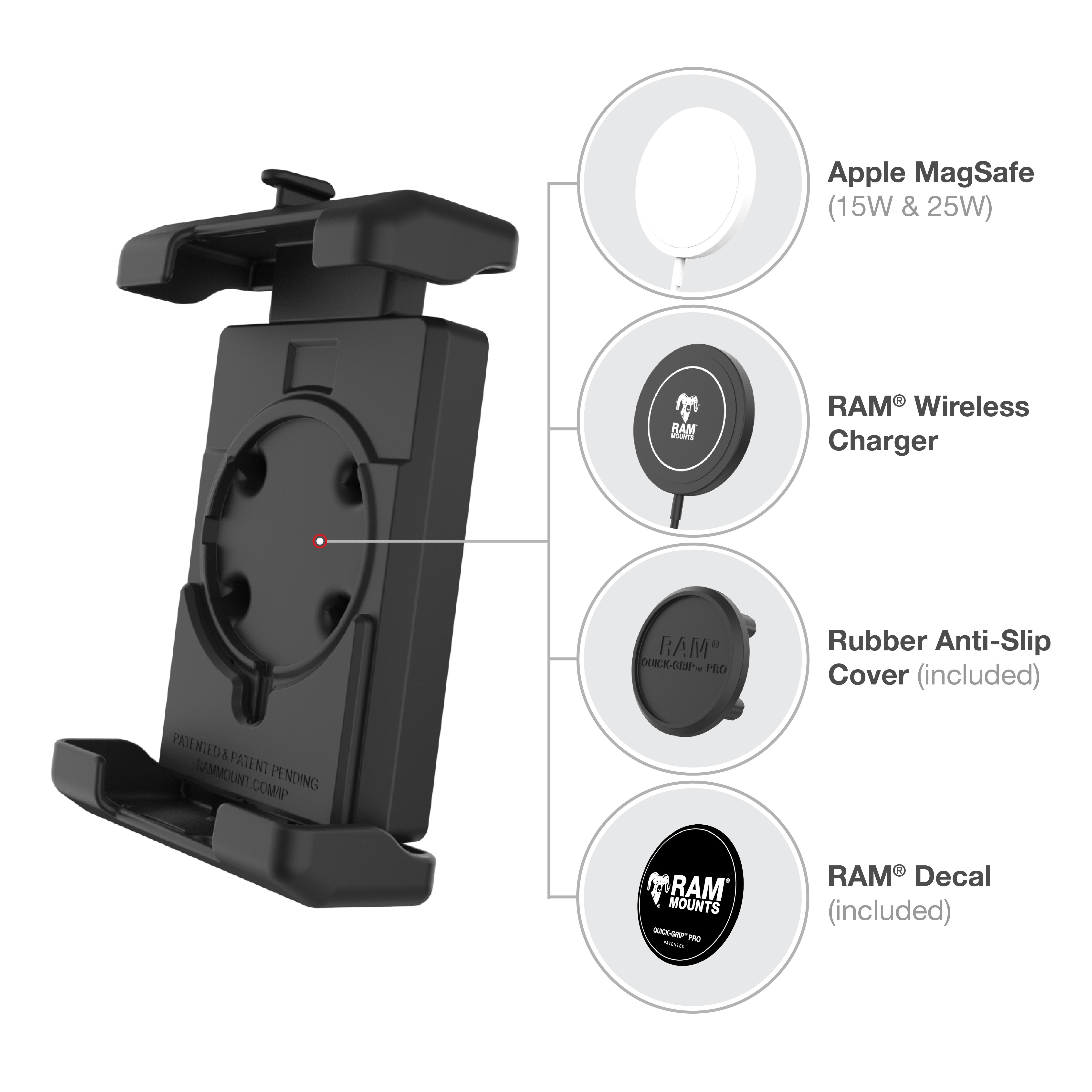• Centrale holte compatibel met RAM® Qi2 Wireless Charger en Apple MagSafe puck; antisliphoes en puck plakmiddel inbegrepen