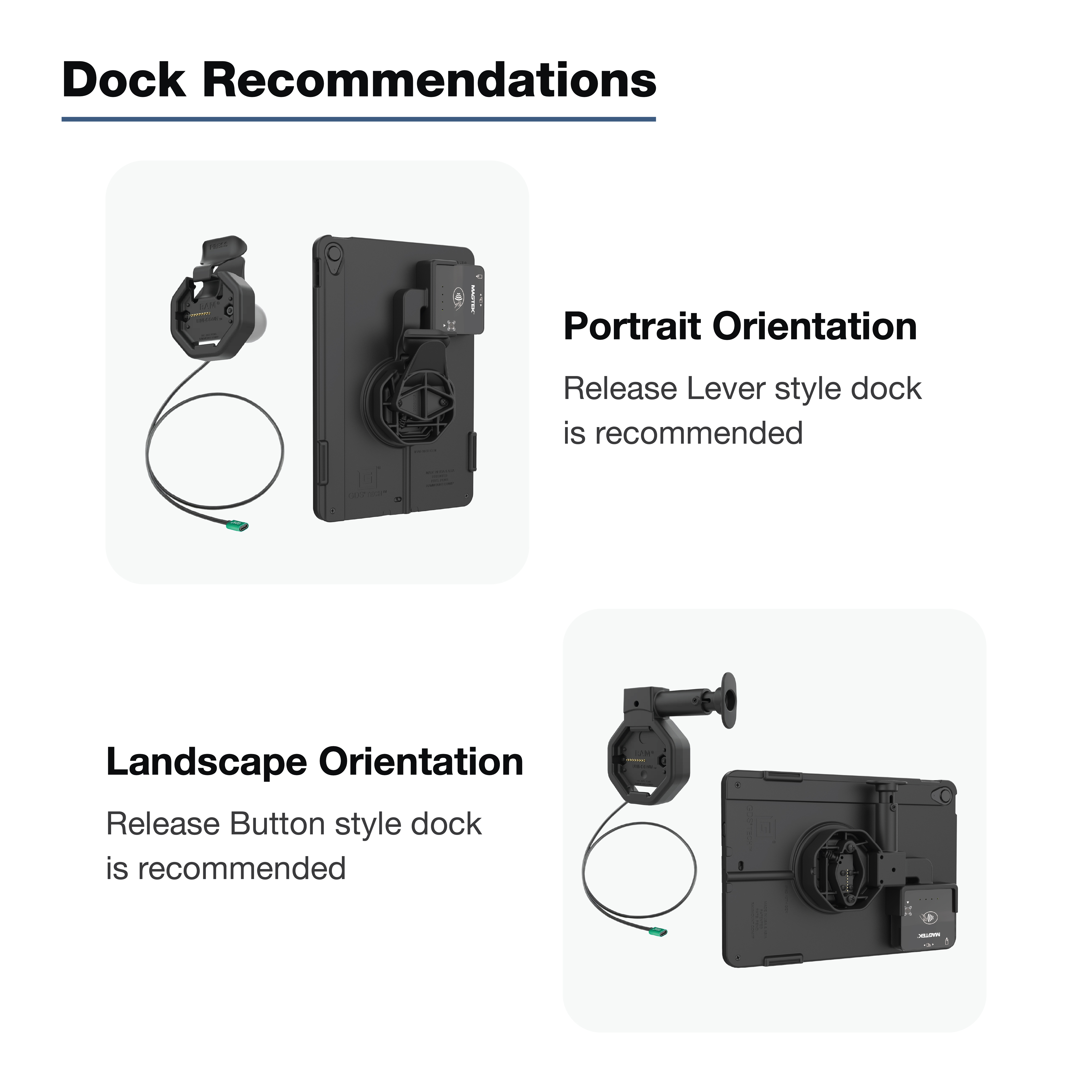 The IntelliSkin Thin-Case for iPad 10th/11th Gen & MagTek Module (RAM-GDS-SKIN-AP40-TCB-C) is a low-profile, two-piece device enclosure with an integrated payment module holder designed for the MagTek DynaFlex II Go. The form-fit payment module enclosure features an integrated power cable, keeping both the device and the payment module powered while docked, while the low-profile design allows easy access to the payment module in both portrait and landscape orientations. The robust polycarbonate shell protects your device from daily wear and tear, while the complete enclosure helps deter unauthorized access to the tablet, providing additional peace of mind in high-traffic environments. The flat, ruggedized pogo pad contacts are built for repetitive docking to help protect the devices port and reduce dirt buildup, making them easier to clean. Integrated USB Type-C connectors at both the bottom of the case and on the side of the payment module allow for charging even without a GDS Powered Uni-Conn Dock available. The IntelliSkin Thin-Case for the Samsung Tab A11+ is only compatible with GDS Powered Uni-Conn docks, easily identified by the GDS Powered Uni-Conn Adapter emblem. One Dock to Connect Them All. Always Protected. Always Connected.