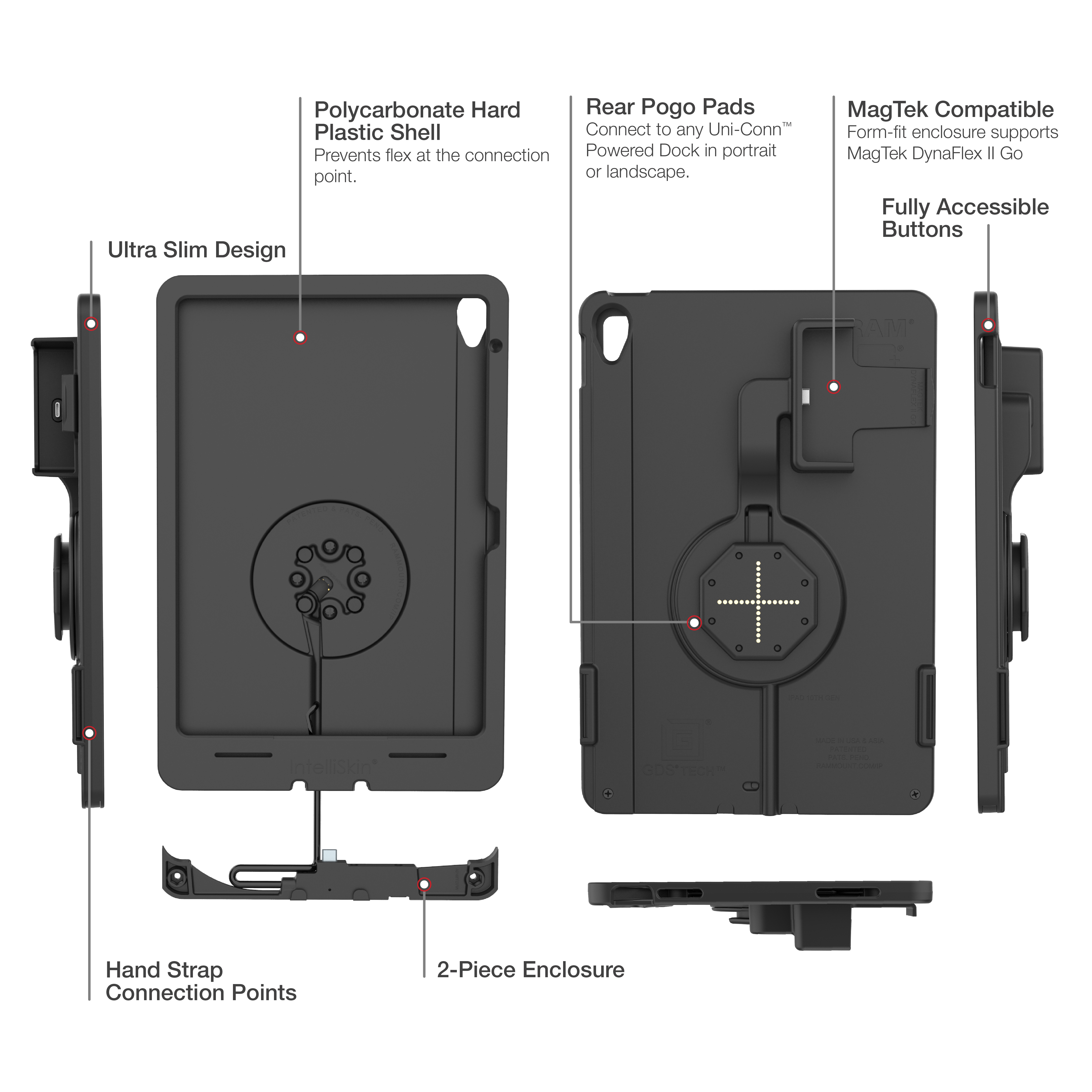 • Two-piece, hard plastic enclosure for iPad 10th/11th Gen with integrated GDS® Uni-Conn™ adapter with rear pogo pads