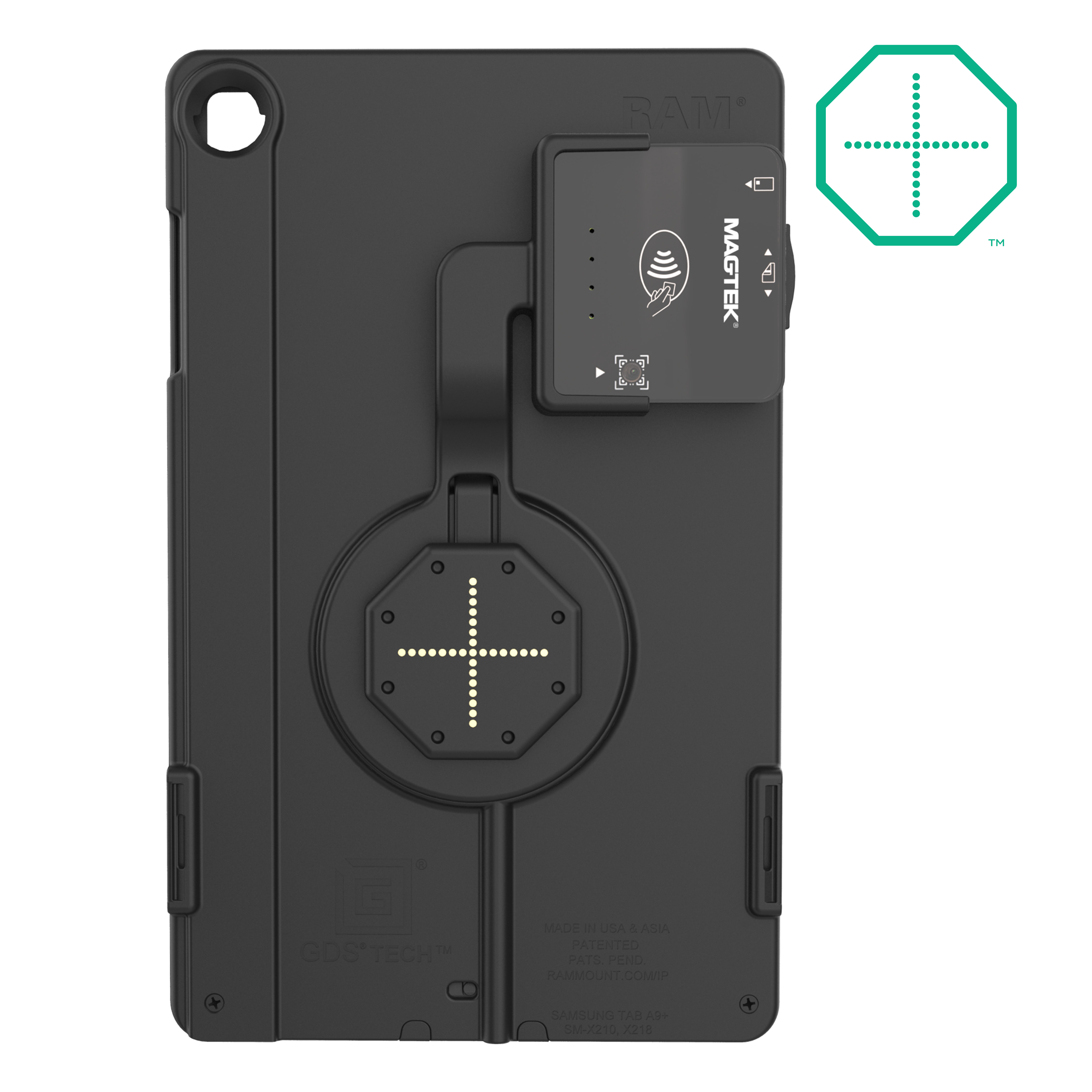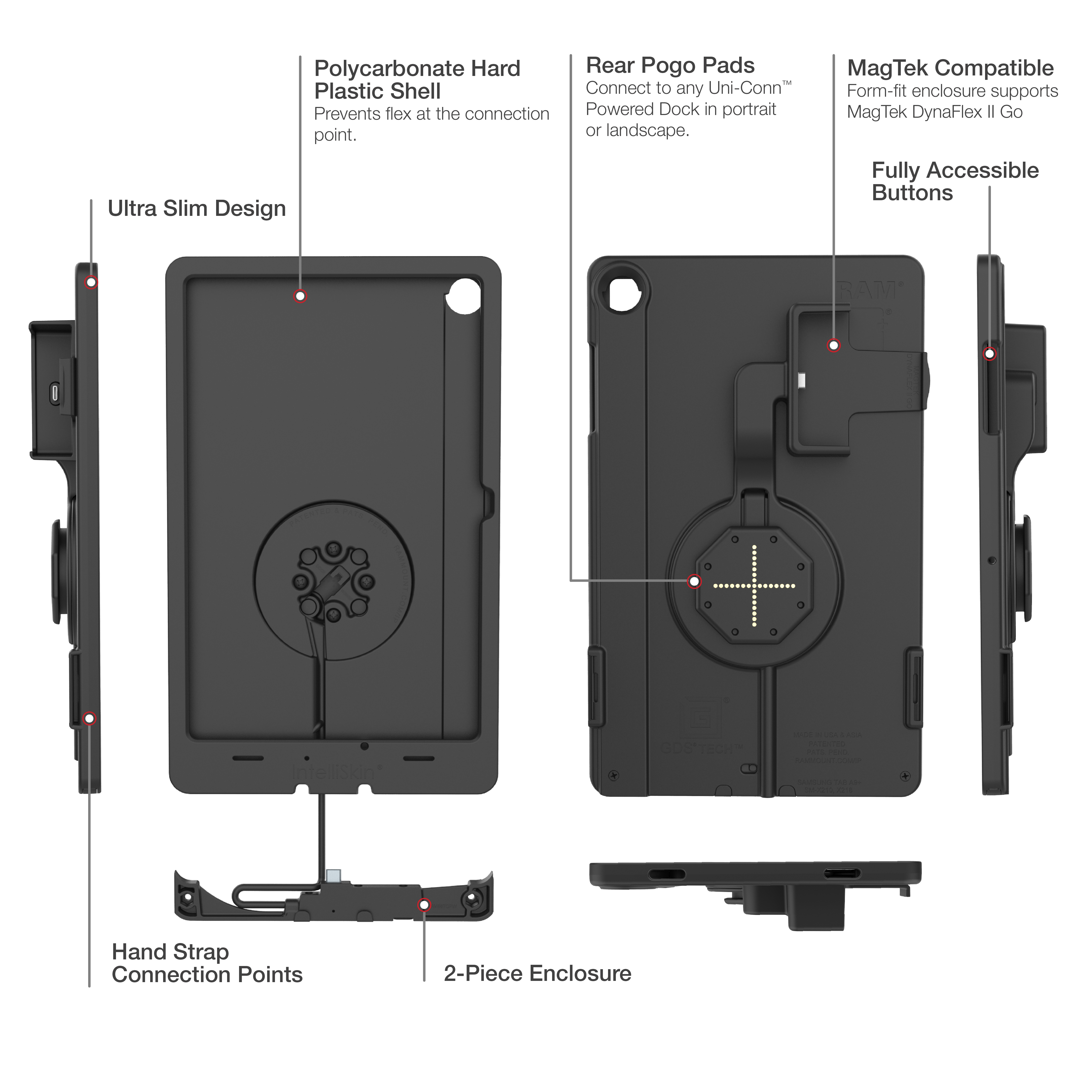 • Two-piece, hard plastic enclosure for Samsung A9+/A11+ with integrated GDS® Uni-Conn™ adapter with rear pogo pads