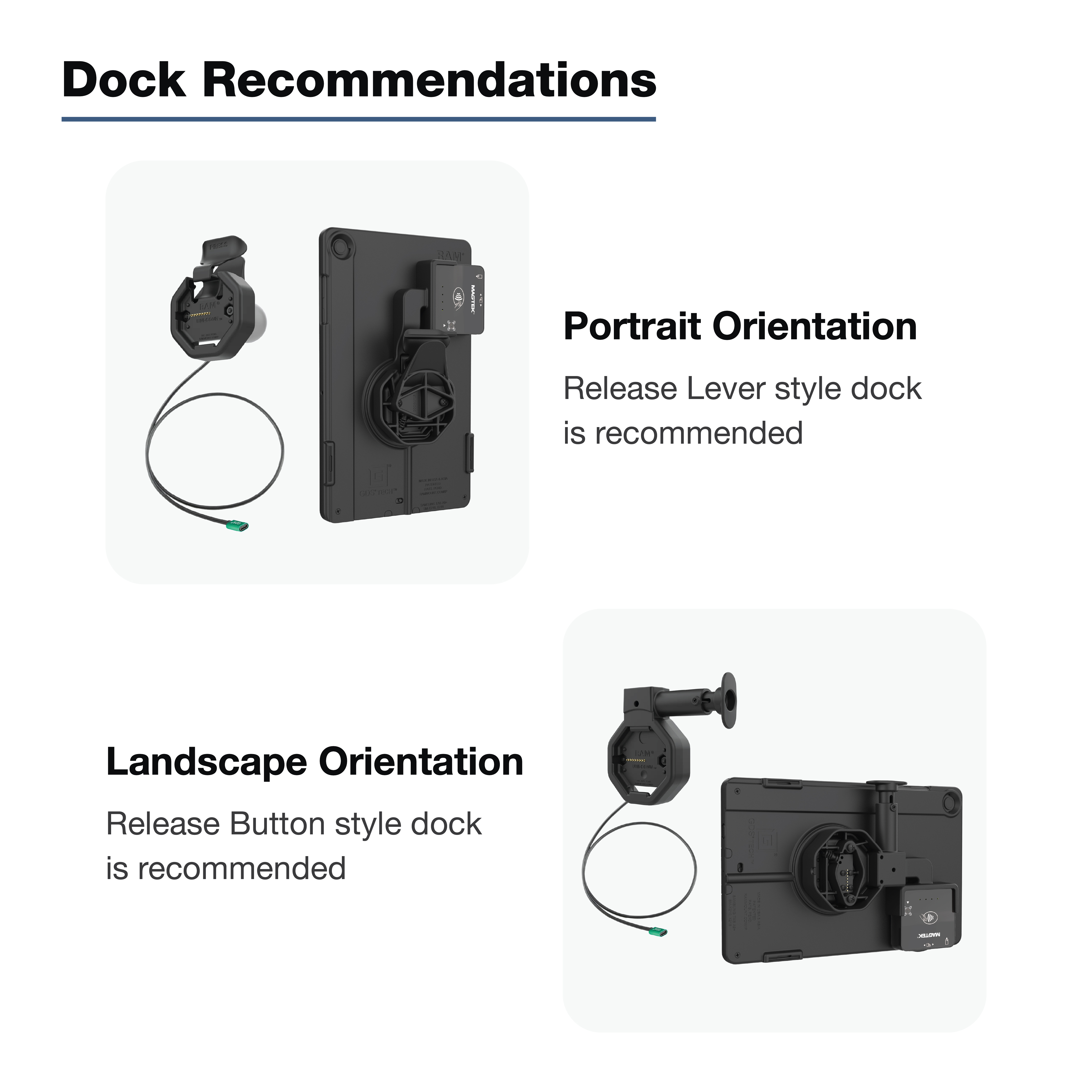 The IntelliSkin Thin-Case for Samsung Tab A9+/A11+ & MagTek Module (RAM-GDS-SKIN-SAM88-1-TCB-C) is a low-profile, two-piece device enclosure with an integrated payment module holder designed for the MagTek DynaFlex II Go. The form-fit payment module enclosure features an integrated power cable, keeping both the device and the payment module powered while docked, while the low-profile design allows easy access to the payment module in both portrait and landscape orientations. The robust polycarbonate shell protects your device from daily wear and tear, while the complete enclosure helps deter unauthorized access to the tablet, providing additional peace of mind in high-traffic environments. The flat, ruggedized pogo pad contacts are built for repetitive docking to help protect the devices port and reduce dirt buildup, making them easier to clean. Integrated USB Type-C connectors at both the bottom of the case and on the side of the payment module allow for charging even when a GDS Powered Uni-Conn Dock is not available. The IntelliSkin Thin-Case for the Samsung Tab A11+ & A9+ is only compatible with GDS Powered Uni-Conn docks, easily identified by the GDS Powered Uni-Conn Adapter emblem. One Dock to Connect Them All. Always Protected. Always Connected.