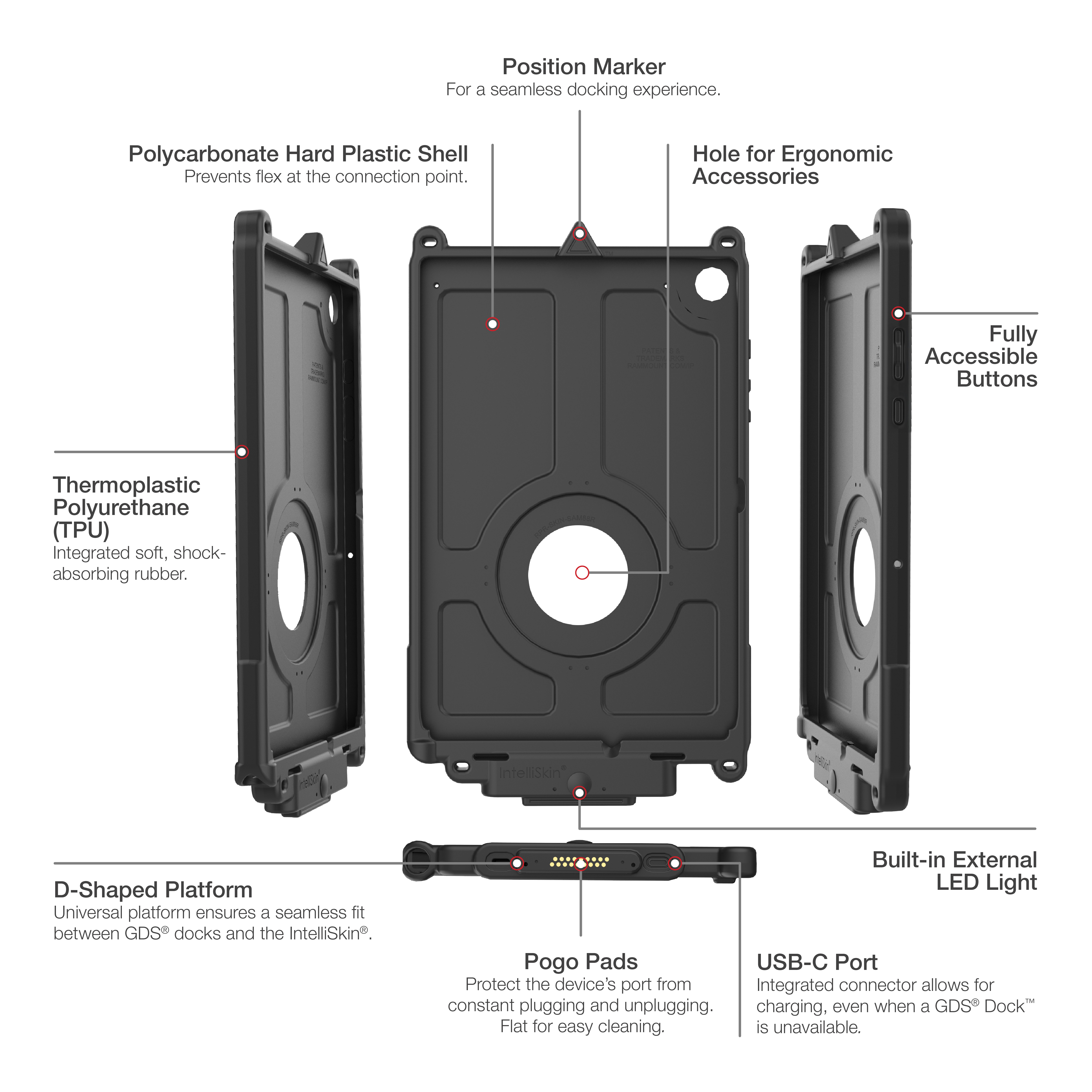 • Enhanced durability protecting the device's USB-C port by converting the connection point to ruggedized pogo pad docking contacts for charging and data sync capabilities