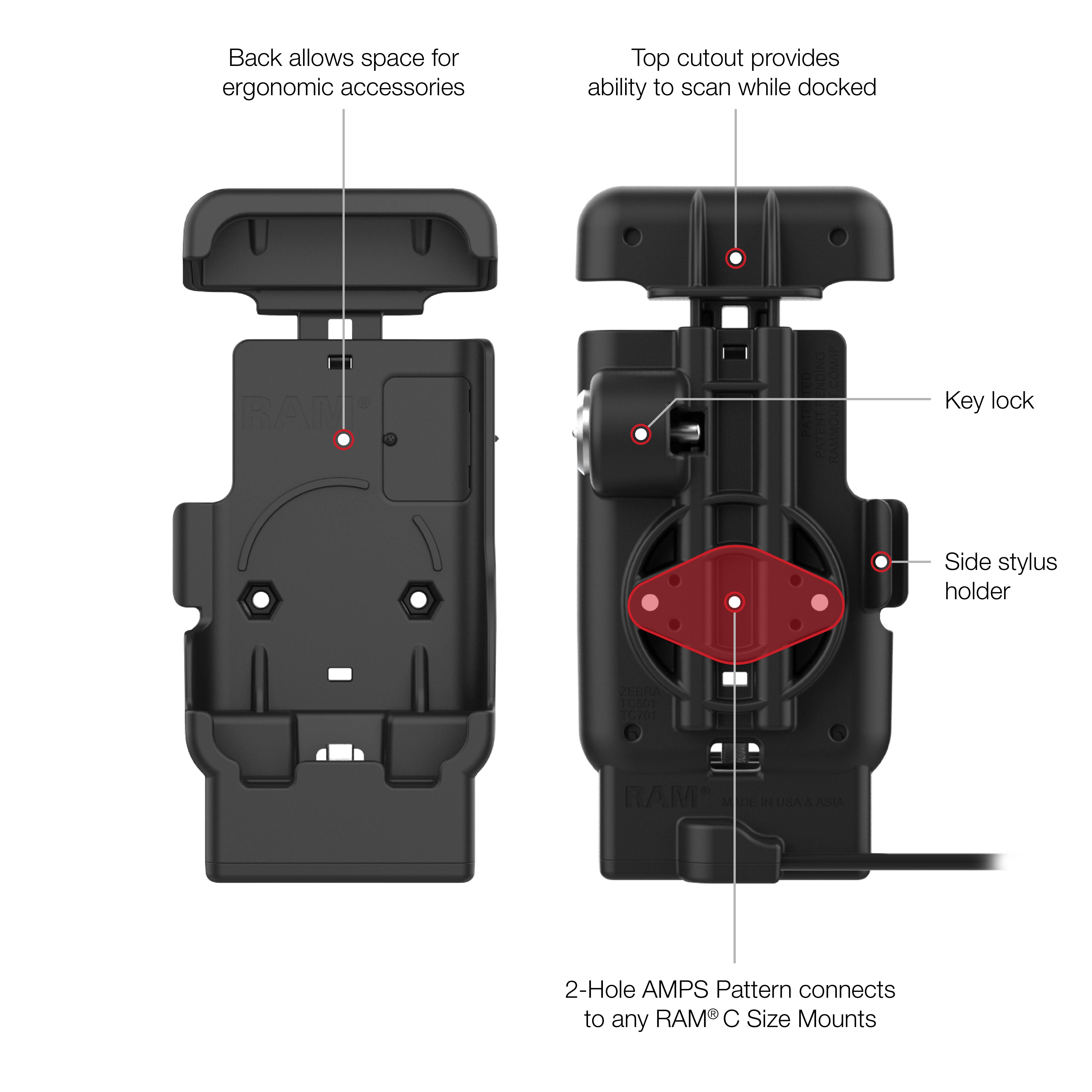 De RAM Vergrendelbaar Powered Oplaadstation met USB-C voor Zebra TC701 (RAM-HOL-ZE41KL-C-1U) is gebouwd om workflows mogelijk te maken die afhankelijk zijn van gegevensoverdracht, zoals het verbinden met werkstations via Zebra's Workstation Connect. Het veergeladen ontwerp stelt gebruikers in staat apparaten snel en met vertrouwen te docken, minimaliseert onhandigheid en vermindert het risico op beschadiging van de USB-C connector. De geïntegreerde uitsparing in de bovenzijde biedt toegang tot knoppen, poorten en scanners zonder het apparaat te verwijderen, zodat de productiviteit nooit vertraagt. Voor extra beveiliging in omgevingen met veel verkeer, biedt het geïntegreerde Key Locking betrouwbare diefstalpreventie. Voltooi uw montagetoepassing met vertrouwen – deze houder is RAM Compatibel en beschikt over een AMPS gatenpatroon met 2 gaten voor naadloze integratie met een diamant kogeladapter.