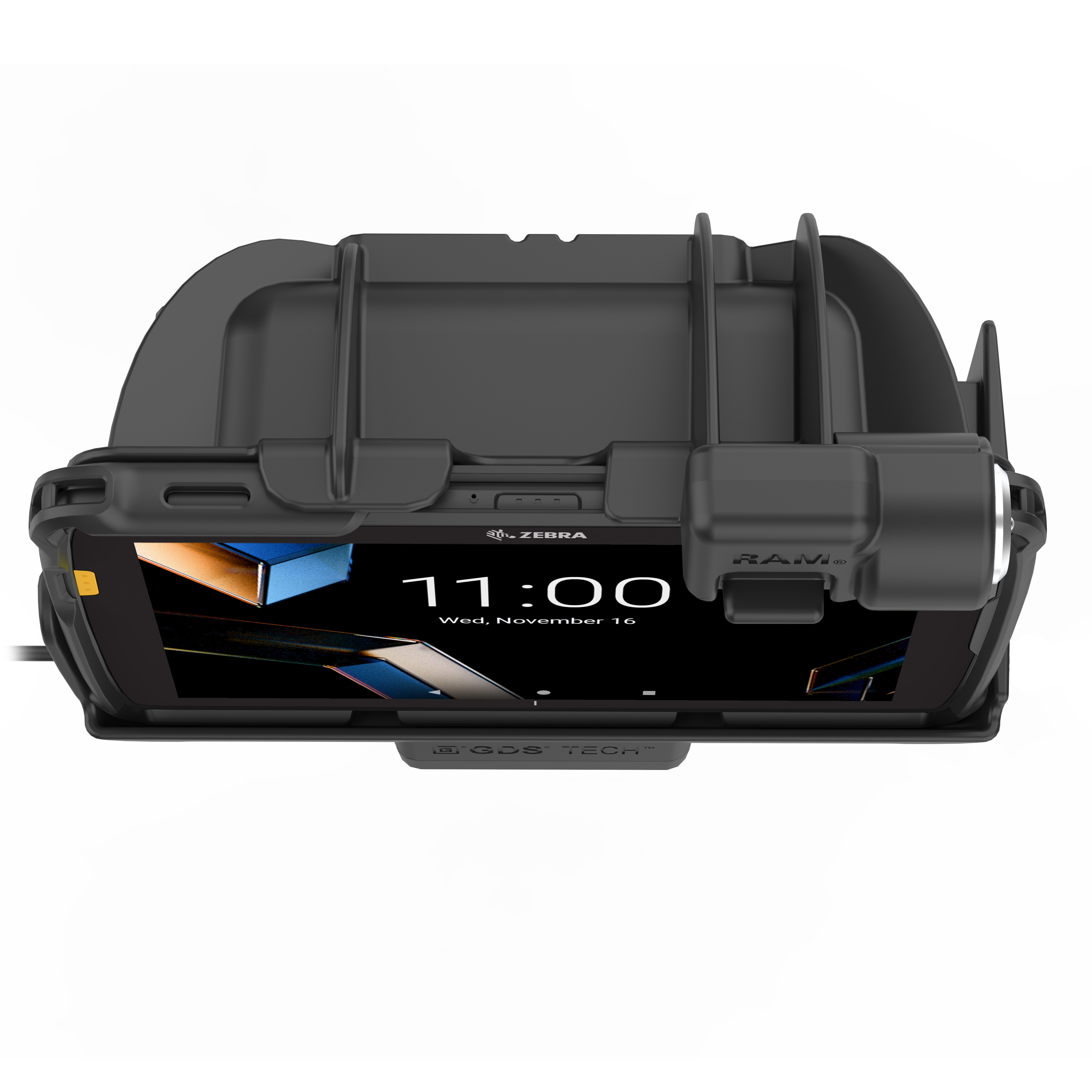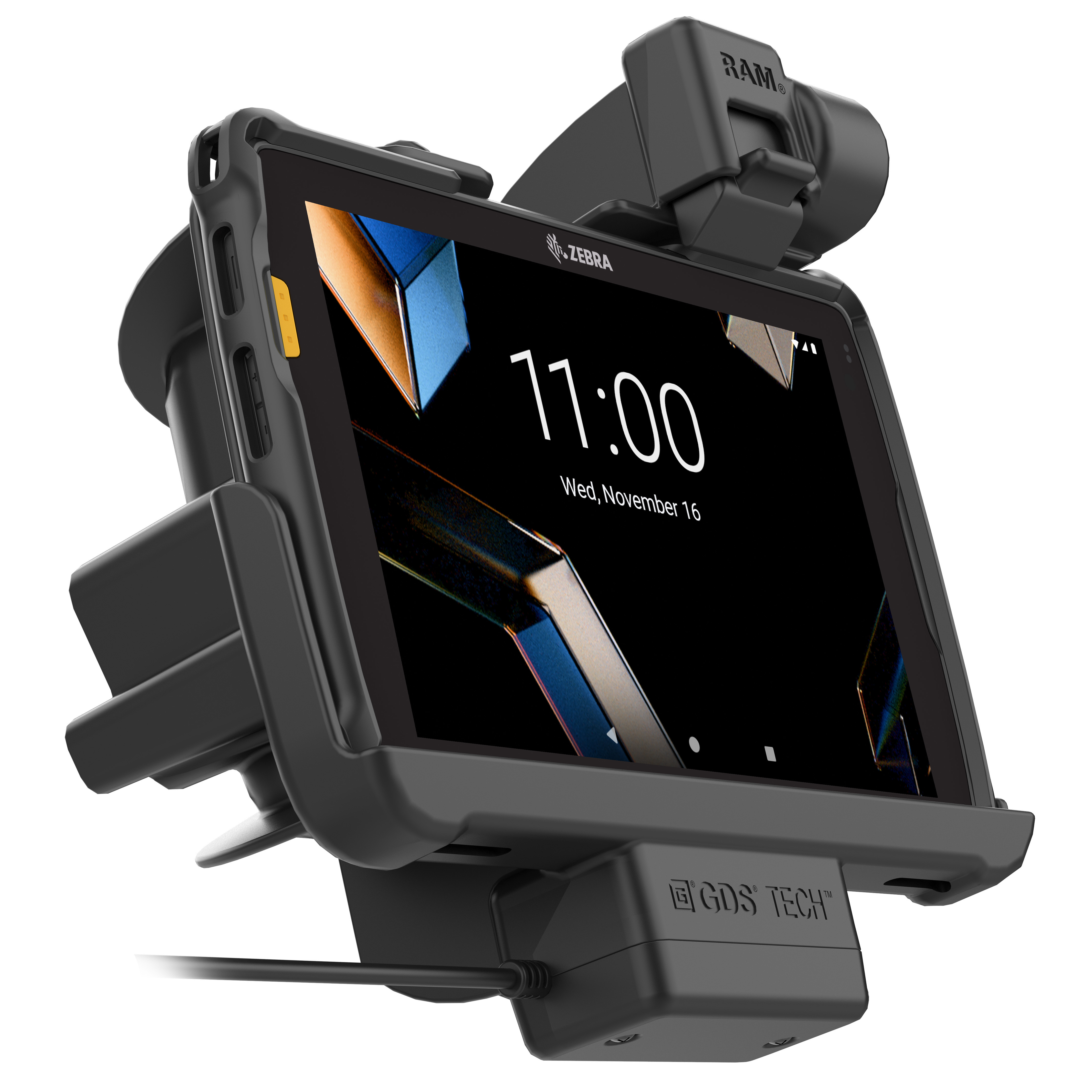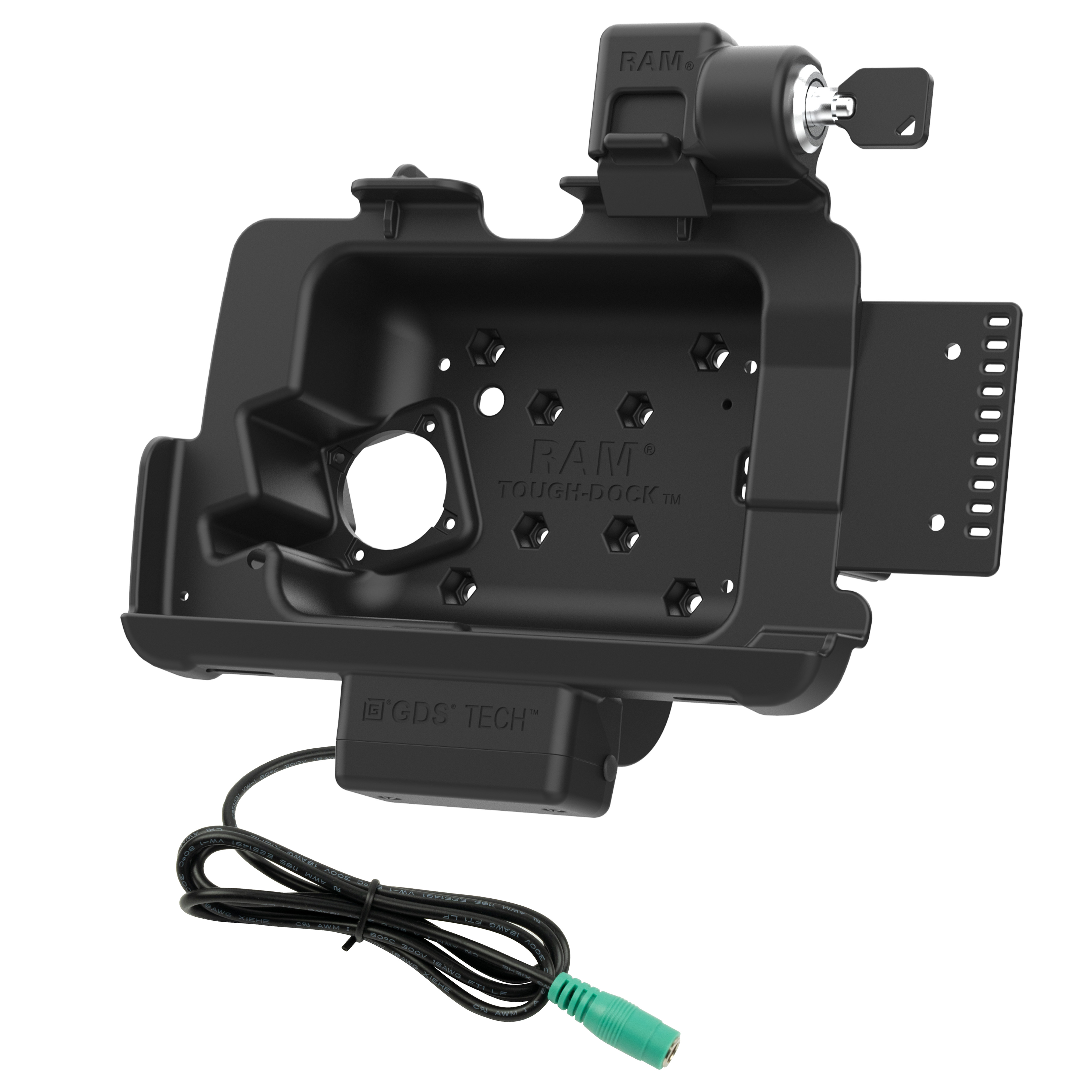 Voorzien van oplaadmogelijkheden en een key locking voor diefstalpreventie, werkt de RAM® Tough-Dock™ (RAM-HOL-ZE44PLU) met de Zebra ET401 met RAM® Skin™. Stroom wordt geleverd via een 5.5mm DC cilindervormige connector en stelt u in staat het apparaat opgeladen te houden via de pogo-pin contacten wanneer het apparaat is gedockt. Een enkele USB Type-A krulsnoer-aansluiting wordt meegeleverd voor het toevoegen van één extra invoerapparaat. Het docking station omvat ook ruimte aan de achterzijde voor tablet uitbreidingen zoals de Zebra Expansion Back, PowerPack Battery en GDS Ergo accessoires zoals de GDS Roto-Mag en GDS Hand-Stand. Om dit docking station te monteren, combineer elke C en D Maat RAM 4-gats AMPS of 75mm x 75mm VESA patroon bases voor het bevestigen van een dubbele arm om uw montageoplossing te voltooien. Breng de oplossing een stap verder door te profiteren van de ingebouwde 2-gats montageplaat die compatibel is met de RAM 2-gats diamantbasis voor aanvullende apparaatmontage zoals een telefoon, scanner, printer of elk ander draagbaar apparaat.