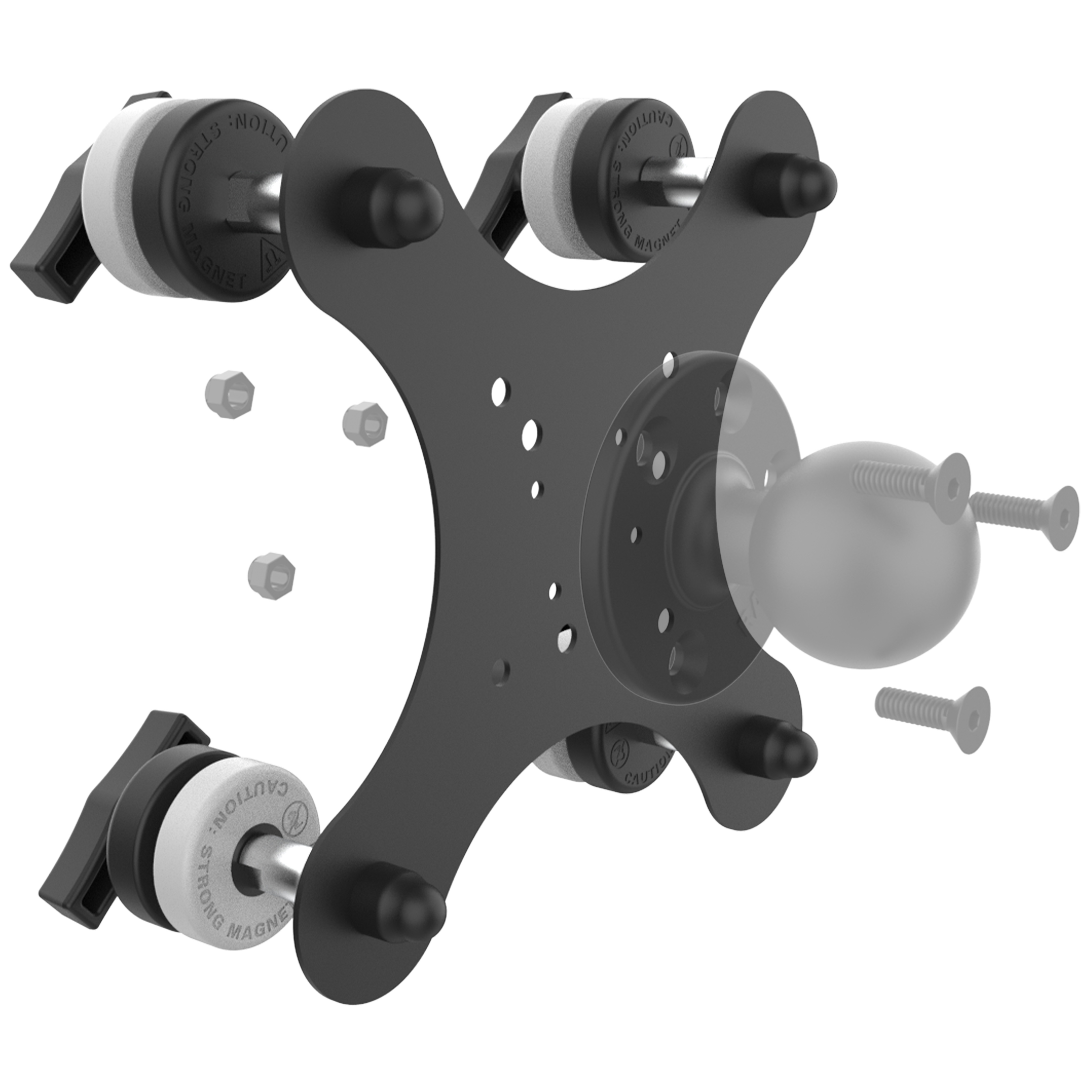 The RAM Tough-Mag 48MM 4-Point Pivoting Magnetic Mounting Base (RAM-MAG48-4S-PIV1U) is a versatile mounting solution designed for flat glass or metal surfaces such as vehicle windows, windshields, or other sturdy panels. This aluminum plate features four external 48mm magnets, three fixed and one pivoting corner magnet, for added flexibility when positioning and securing the base. The plate includes pre-drilled 4-hole AMPS and VESA patterns, allowing easy attachment of a C or D size drill-down ball base. Each rubber-coated magnet prevents scratches, reduces harsh magnetic pull, and includes a handle for quick installation and removal. The pivoting corner ensures easier alignment on curved or uneven surfaces while maintaining a rock-solid hold. Compatible with any flat surface up to 6mm thick, this magnetic mounting base provides strength, adjustability, and convenience for demanding applications.