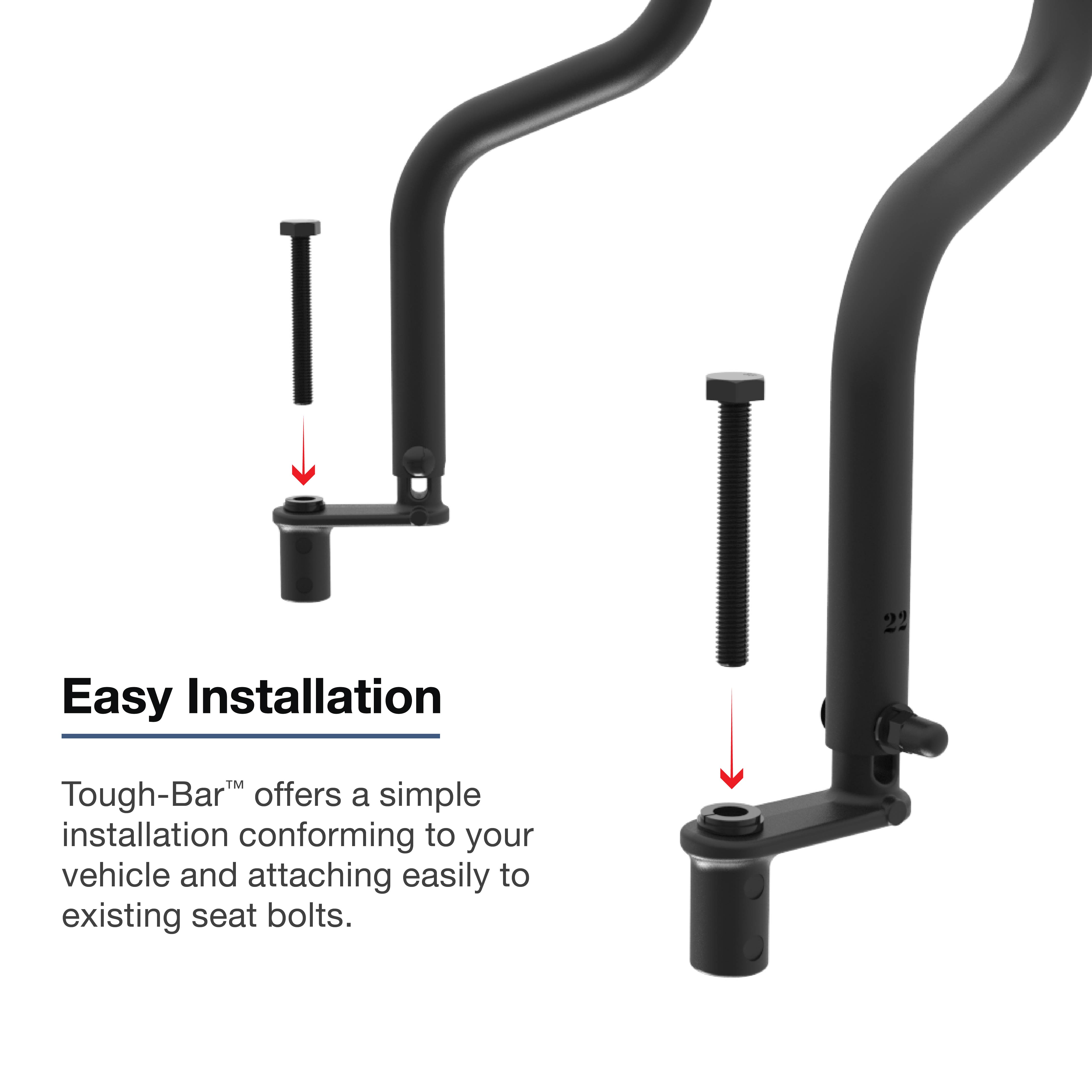The RAM Tough-Bar for '25-26 Ford Interceptor - Setina Console & 8" Screen (RAM-TB-22) is a custom-bent mounting bar engineered to contour perfectly to the vehicles dashboard center console. Designed for maximum stability, the Tough-Bar secures at three key points: the driver seat bolt, passenger seat bolt, and center dashboard, minimizing device vibration and movement even in rugged off-road conditions. The base includes two of the RAM Flex Adhesive Kogel Base for a no-drill installation onto the dashboard, and includes screws for a more permanent mounting option. Its low-profile design preserves passenger legroom while keeping devices securely mounted and out of the drivers line of sight. The RAM Tough-Bar supports unlimited customization with components made specifically for the bar and is fully compatible with all RAM rail bases, including the RAM Tough-Claw, U-Bolt Base, and Torque Base. Built with safety and versatility in mind, the RAM Tough-Bar for Ford Interceptor offers a clean, factory-style fit for mounting multiple devices without obstructing visibility or interior comfort.