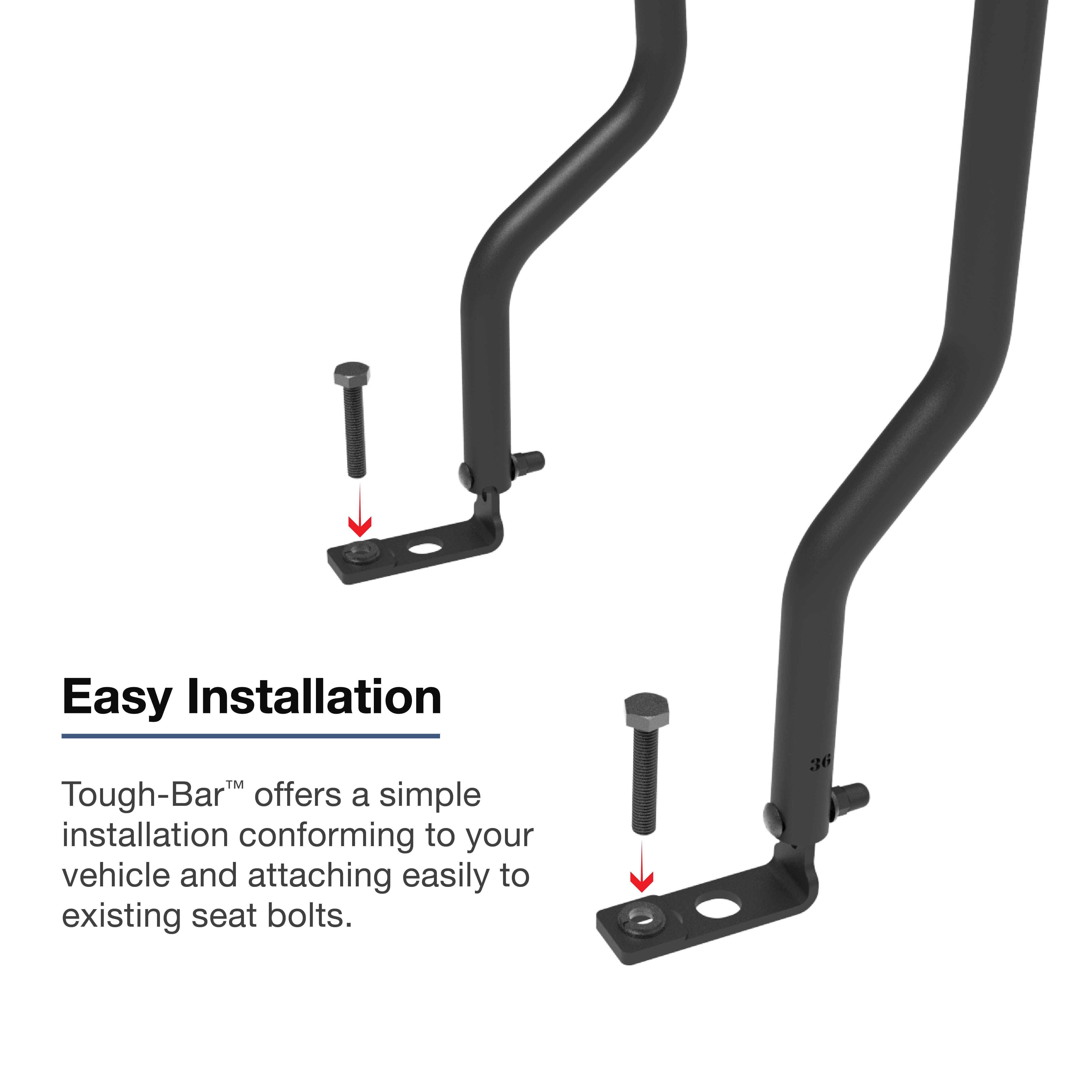 The RAM Tough-Bar for '24-26 Jeep Wrangler & Gladiator (RAM-TB-36) is a custom-bent mounting bar engineered to contour perfectly to the vehicles dashboard center console. Designed for maximum stability, the Tough-Bar secures at three key points: the driver seat bolt, passenger seat bolt, and center dashboard, minimizing device vibration and movement even in rugged off-road conditions. The base includes Includes two RAM Composite Kogel Adapters with AMPS Plate for a no-drill installation, using existing hole pattern in the vehicle. Its low-profile design preserves passenger legroom while keeping devices securely mounted and out of the drivers line of sight. The RAM Tough-Bar supports unlimited customization with components made specifically for the bar and is fully compatible with all RAM rail bases, including the RAM Tough-Claw, U-Bolt Base, and Torque Base. Built with safety and versatility in mind, the RAM Tough-Bar for Jeep Wrangler & Gladiator offers a clean, factory-style fit for mounting multiple devices without obstructing visibility or interior comfort.