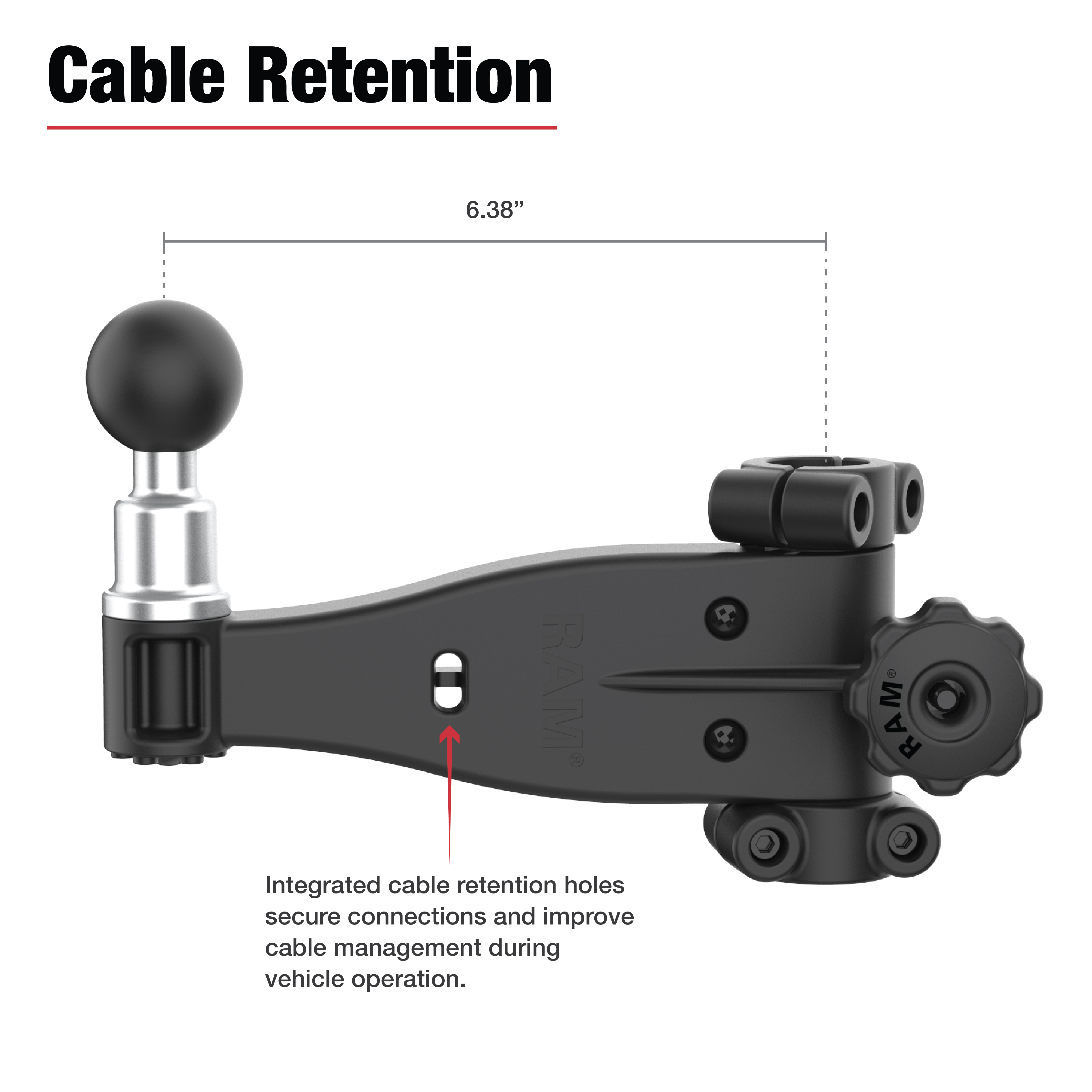 De RAM Wrijvingsscharnierarm met Pin-Lock Kogel voor Tough-Bar (RAM-TB-FHA2-1BU) is een modulaire bevestiging die is ontworpen om je eigen C maat montageoplossing op de RAM Tough-Bar te creëren. Deze opstelling beschikt over een C maat RAM Pin-Lock kogel, waarmee je elke C maat dubbele arm en apparaathouder kunt aansluiten – ideaal voor tablets, GPS-apparaten of andere accessoires. Gecombineerd met een C maat arm biedt deze configuratie tot 180 articulatie, terwijl het geïntegreerde wrijvingsscharnier zorgt voor soepele, enkelassige draaiing voor fijnafstelling van de positie of snelle toegang tot de voertuigbediening. Voor extra veiligheid fungeert het Collar-Lock systeem als een rotatielimiter, waardoor overmatige rotatie wordt voorkomen die de arm of het apparaat tijdens aanpassing of impact in het dashboard zou kunnen sturen. Samen zorgen het wrijvingsscharnier en Collar-Lock voor stabiele, trillingsbestendige prestaties, zelfs in veeleisende omgevingen. De ingebouwde kabelretentiefunctie houdt kabels netjes georganiseerd en vastgezet langs de arm, wat haken of spanning tijdens aanpassing voorkomt. Met zijn duurzame constructie en RAM compatibiliteit biedt de Wrijvingsscharnierarm voor Tough-Bar aanpasbare verstelbaarheid, een stevige grip en betrouwbare bescherming voor je uitrusting en voertuiginterieur.