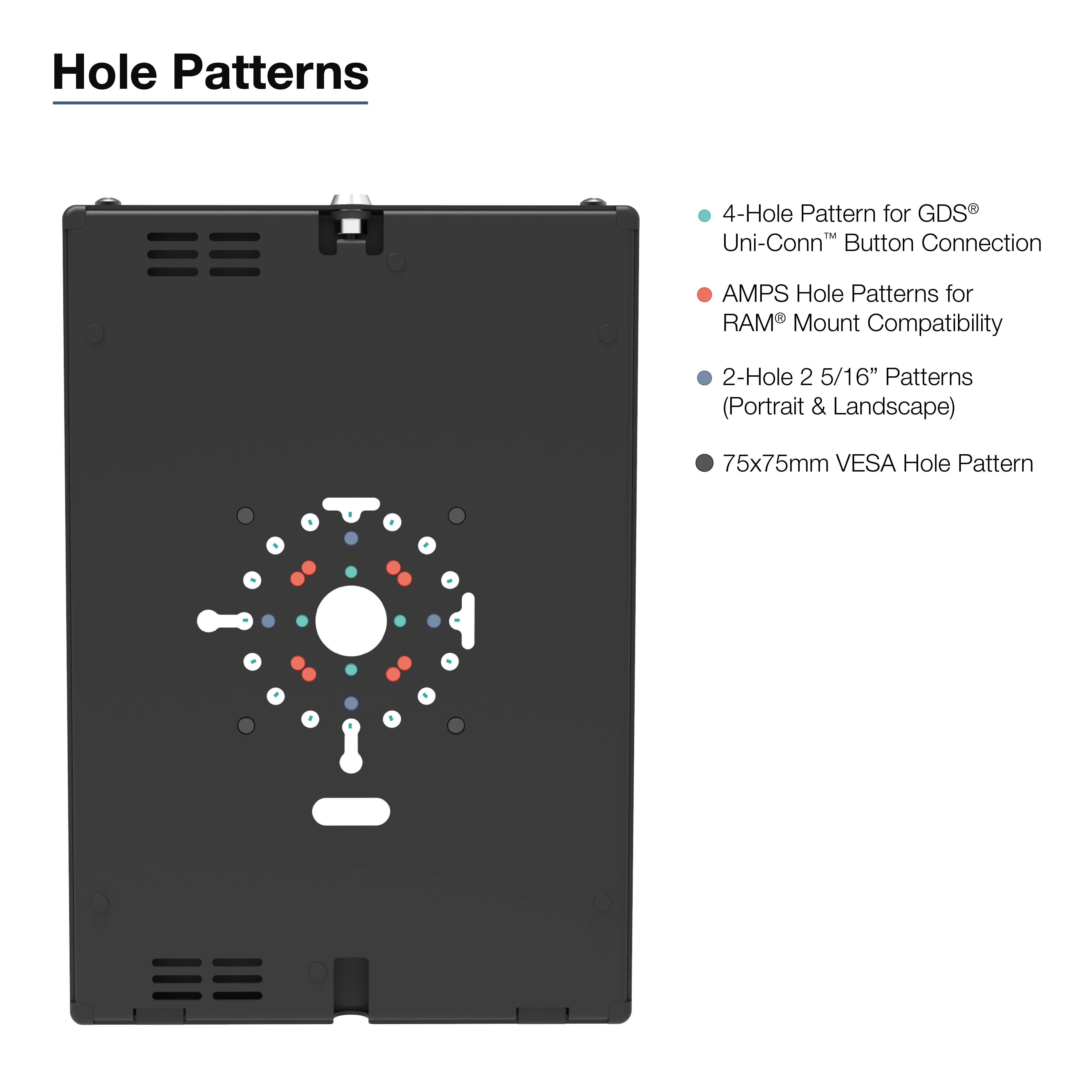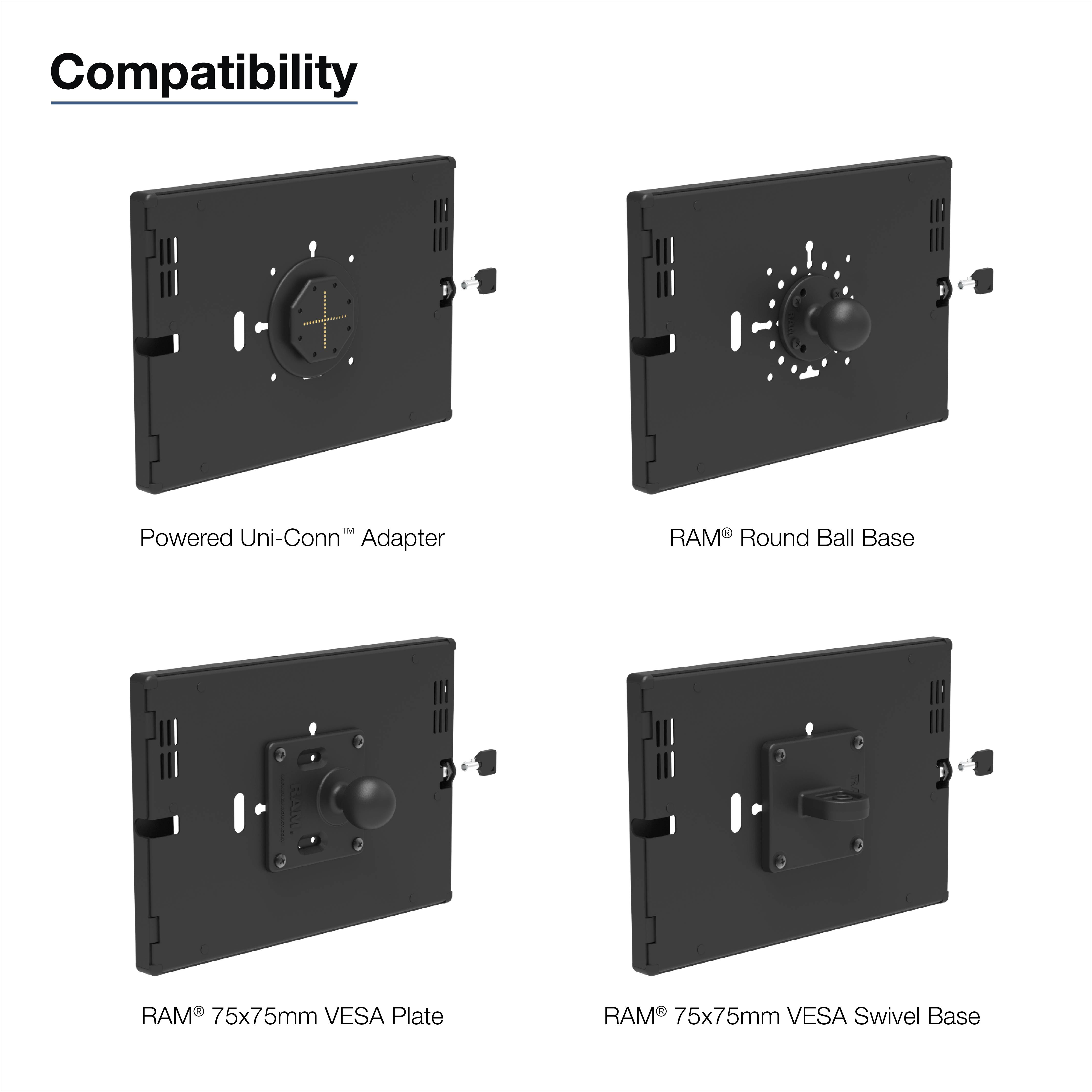 The RAM Safe-Case for Samsung Tab Active5 Pro (RAM-TE-SAM100) is a rugged, modular enclosure designed for high-security environments. Built from durable two-piece steel, this key-locking tablet case protects against theft, tampering, and tough environmental conditionsideal for demanding field or industrial applications. Custom-fit for the Samsung Tab Active5 Pro, the Safe-Case features precision cutouts for full access to the devices lock button and USB-C port. Ventilation slots and speaker openings maintain device functionality without compromising protection. The enclosure features versatile mounting options with integrated hole patterns for flush mounting, compatibility with RAM double ball mounts, or 75x75mm VESA stands. For added docking functionality, the Safe-Case supports the installation of a GDS Uni-Conn buttonenabling rear pogo pin charging when paired with any compatible GDS dock (look for the octagon icon on product listings). Please note that rear and front camera use is restricted while the device is in the Safe-Case.