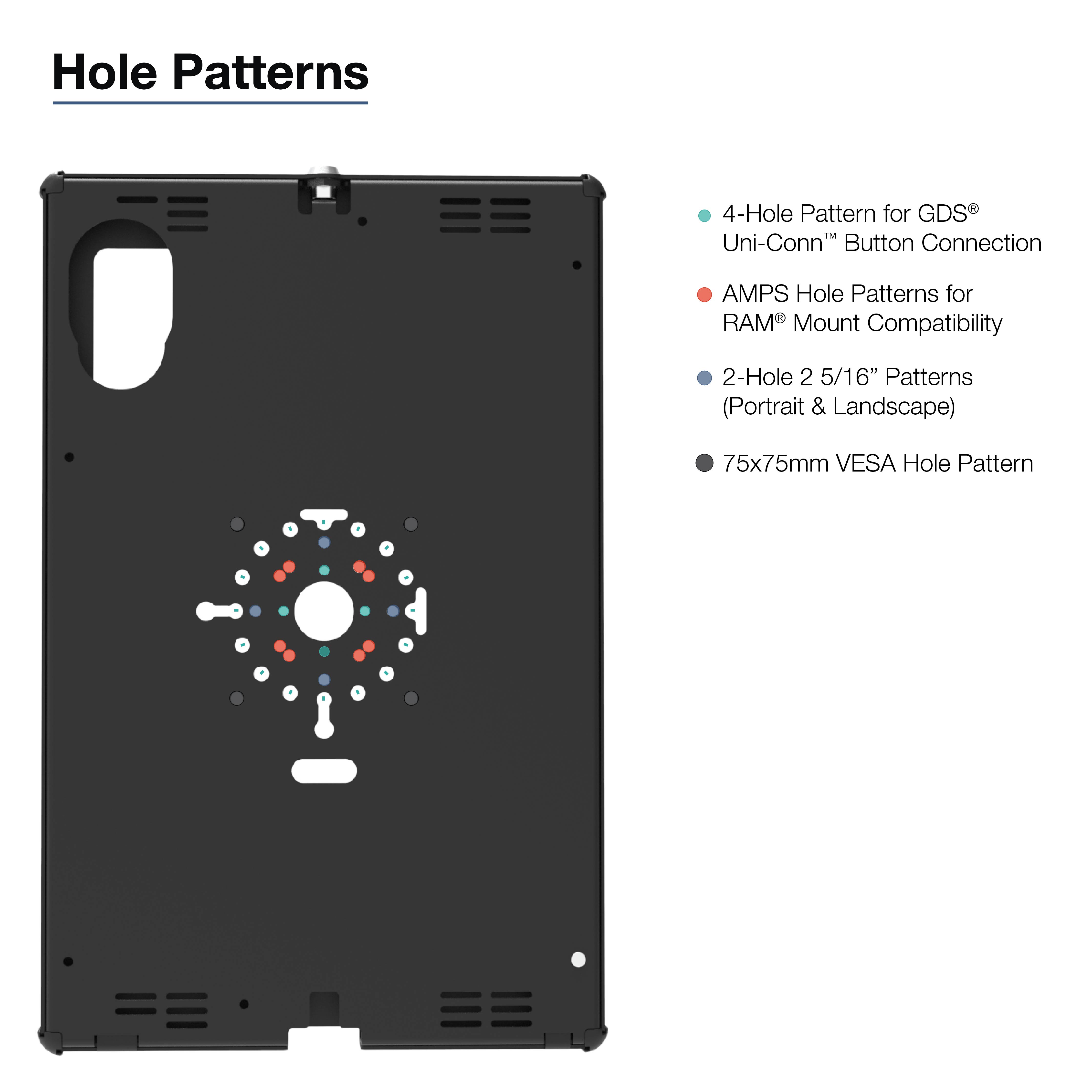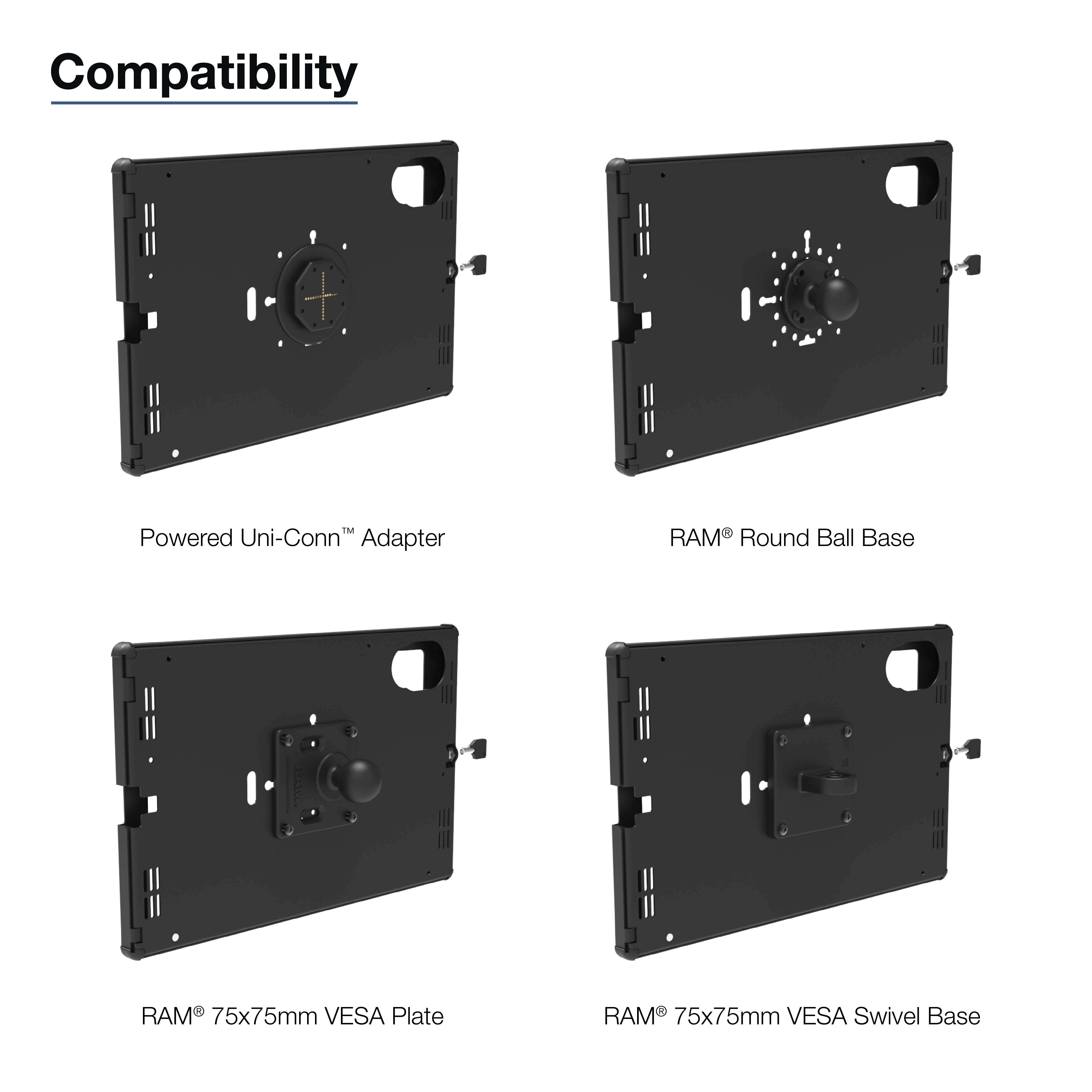 • Te bevestigen op RAM® kogelbevestigingen met VESA- en AMPS-patroon; of vlakke montage